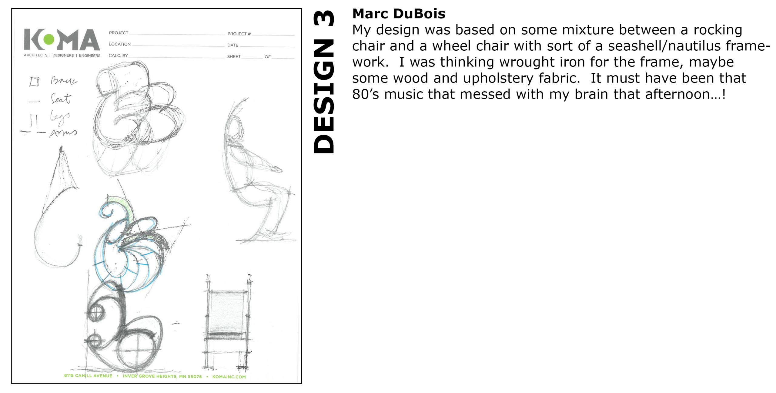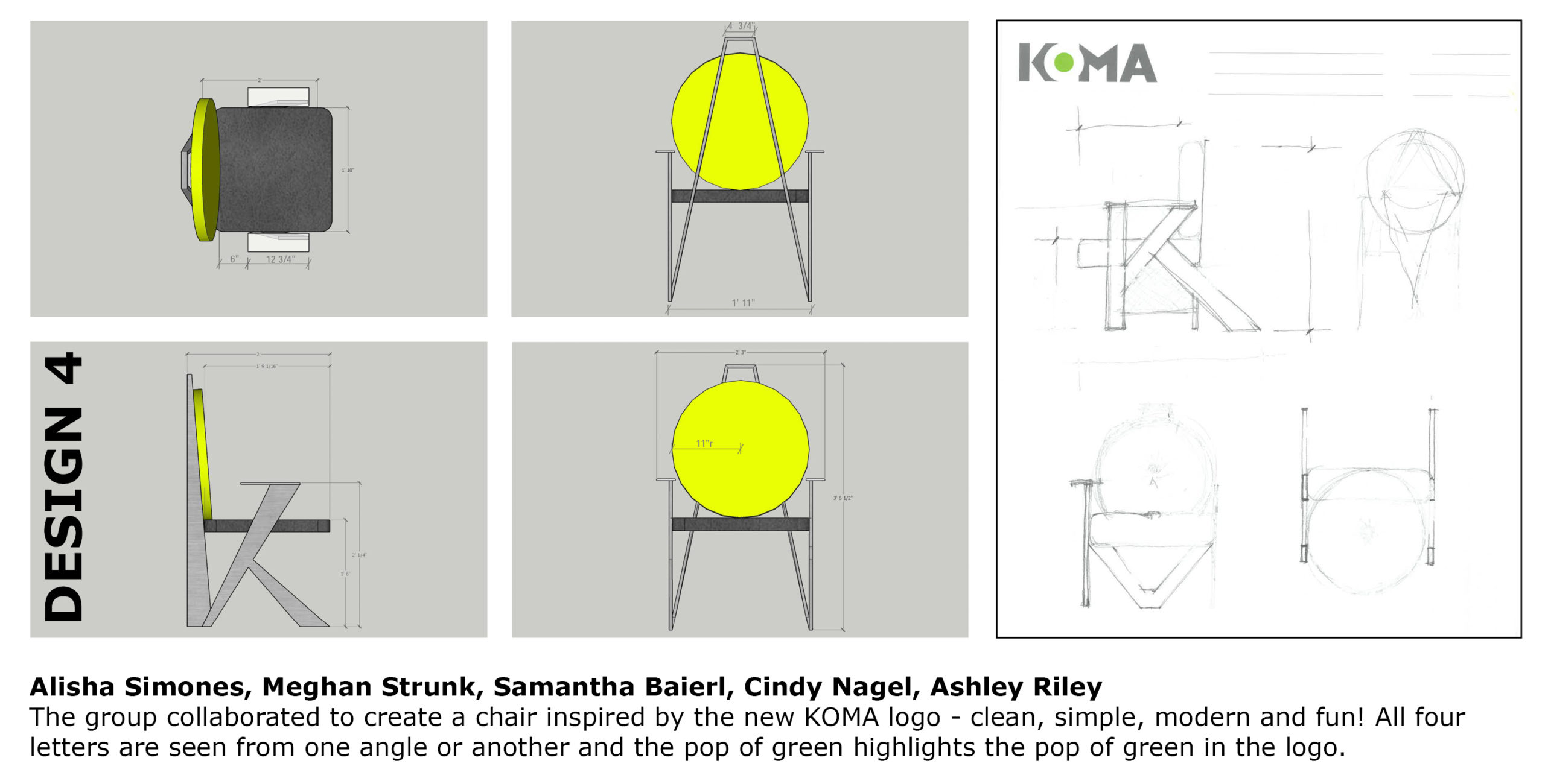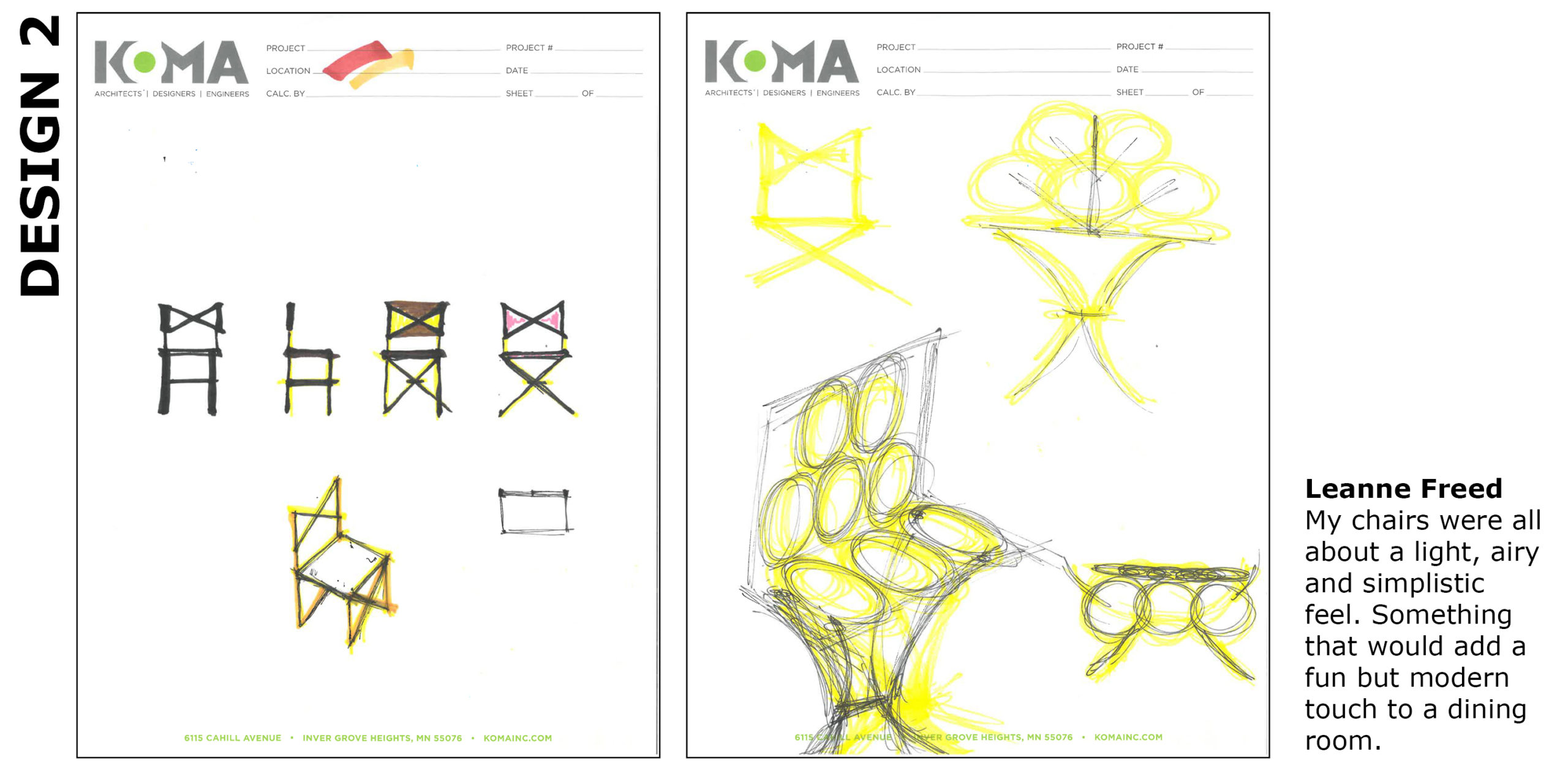 It’s time get inspired! With all creative professions there is value in exercises that encourage vitality, enliven our minds and spur on our imagination. There is value in getting out of our desks, getting face to face and getting those creative juices flowing. Here at KOMA, when we hear about opportunities to come together as a team and step outside of the daily grind, we do our best to take it! Kimball Hospitality, the largest North American furniture supplier in the hospitality furniture industry, presented a “Create A Chair” competition open to all designers in the industry. The contest allowed designers to sketch or create in Revit a custom chair. Below are some of our ideas – maybe they’ll inspire you, designer or not, to find something that fuels your imagination – enjoy!