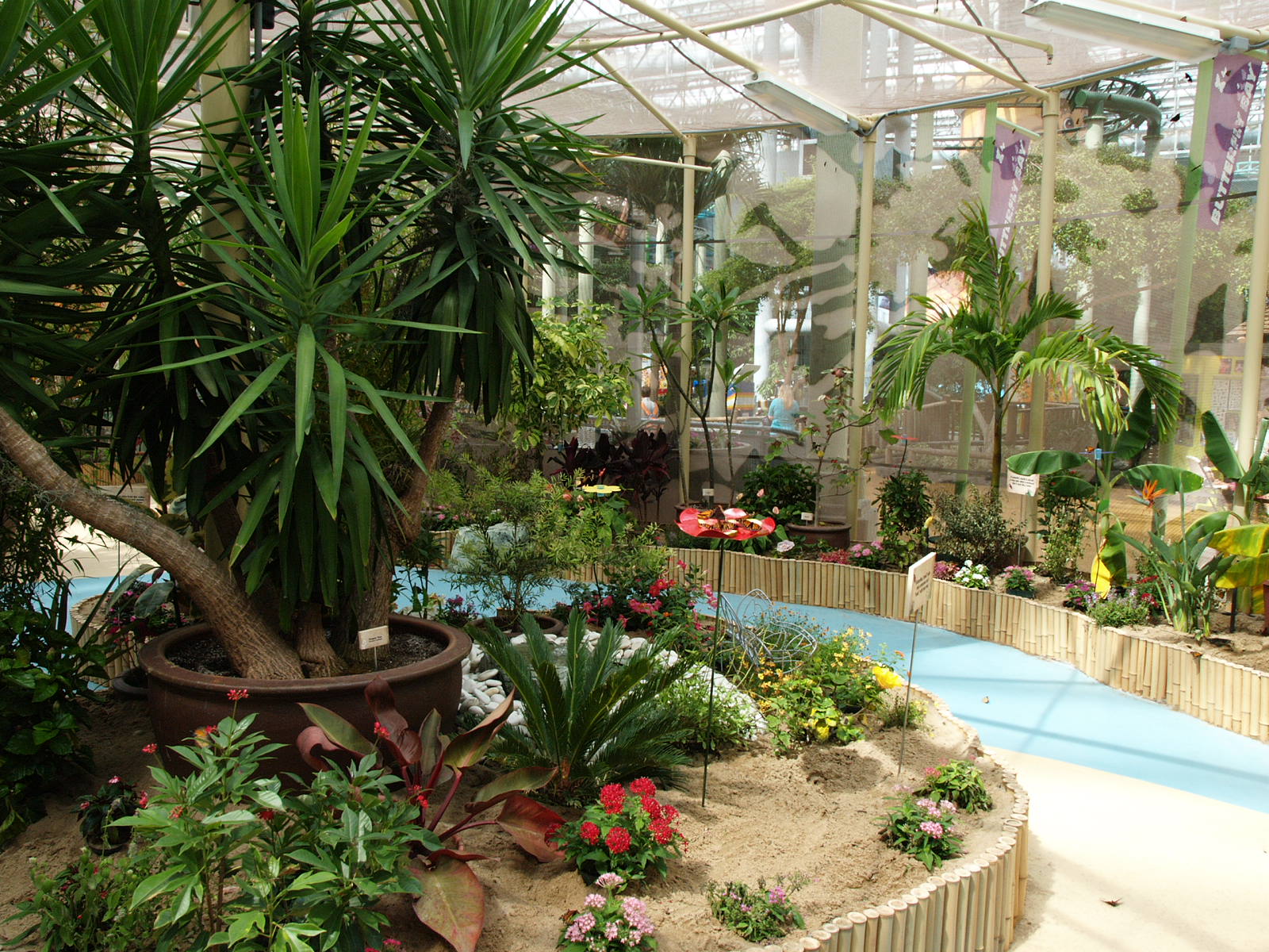 The 1,500-square-foot aviary displays hundreds of tropical plants and flowers from around the world, as well as fresh fruit and other food sources for the butterflies to feed upon. It also offers visitors informational kiosks with details about not only the resident butterflies, but also about energy-saving and Earth-friendly activities for children.