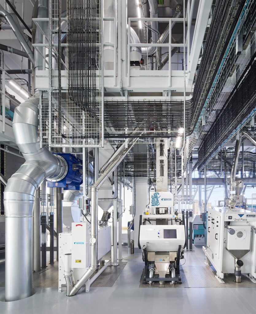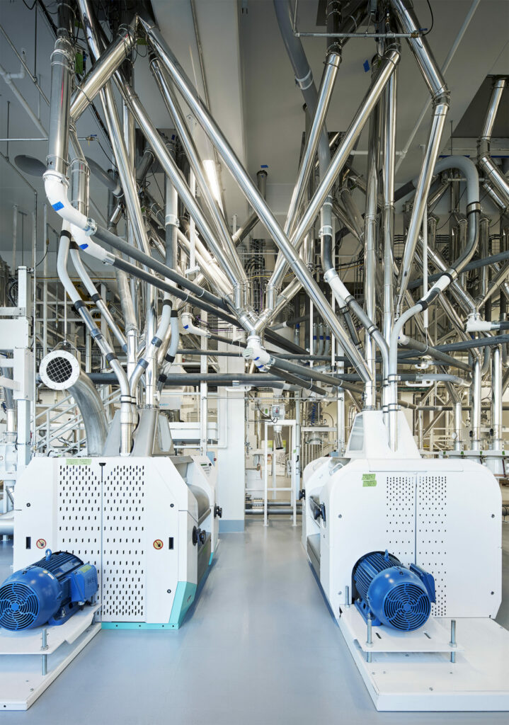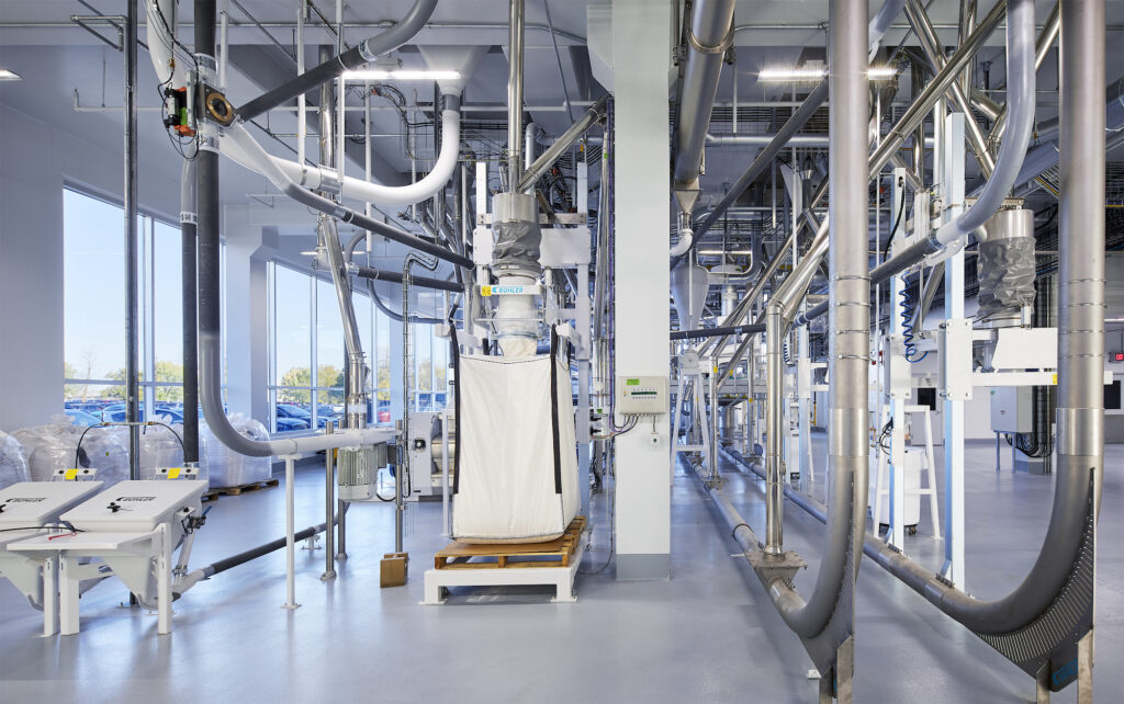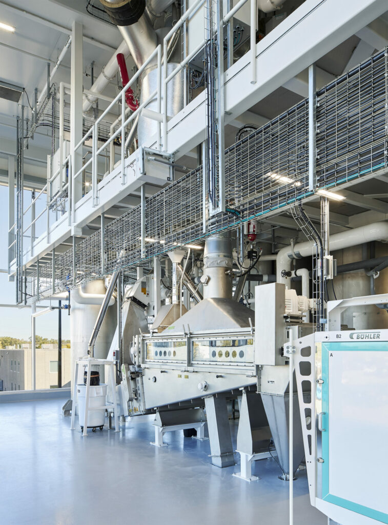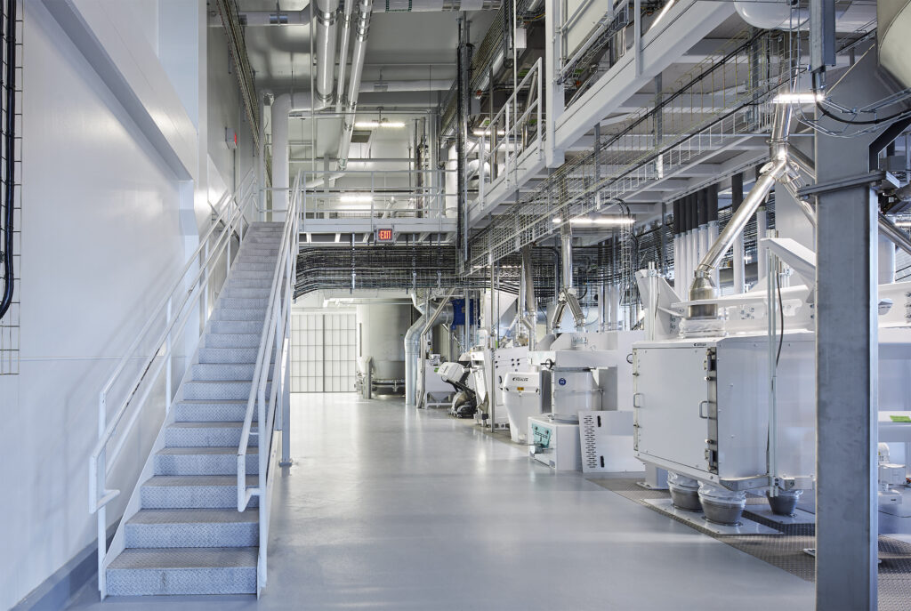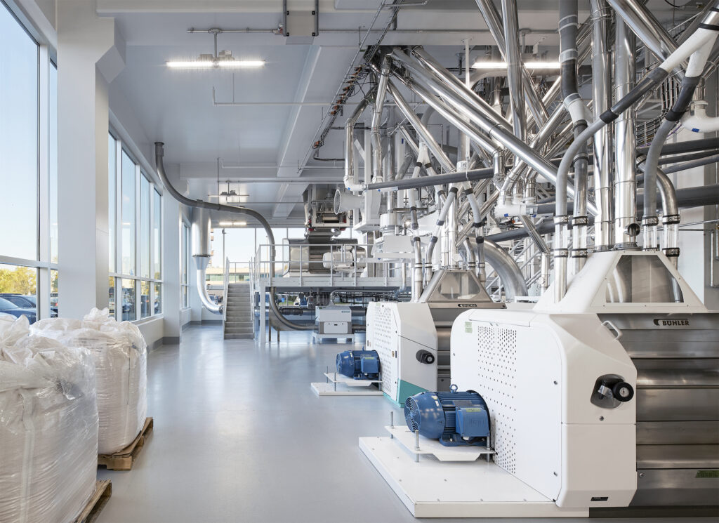 Bühler, a global leader in technologies and services for food production, wanted to create a facility to be used by the company to support start-ups, industry partners and its customers for creating sustainable food value chains that are economically viable in North America. The project consisted of an addition to accommodate a 2-story manufacturing space with a 3rd level mezzanine and a 1 story warehouse. The addition allows Bühler to bring clients through a fully functioning food production space and is designed to highlight their full range of equipment and technologies, viewed from both from the inside and the outside.