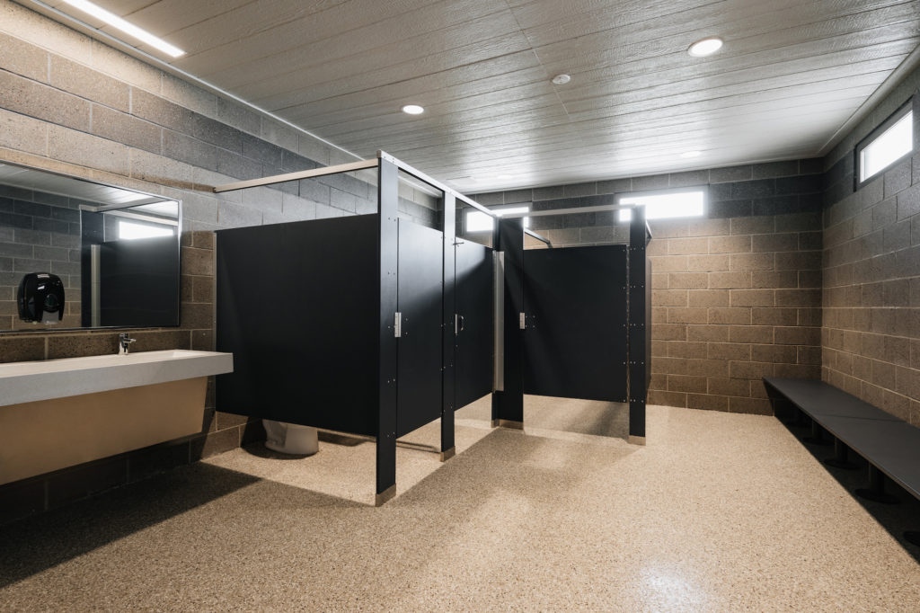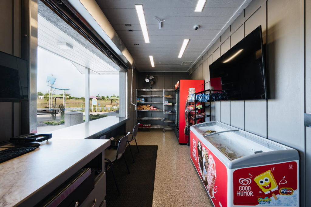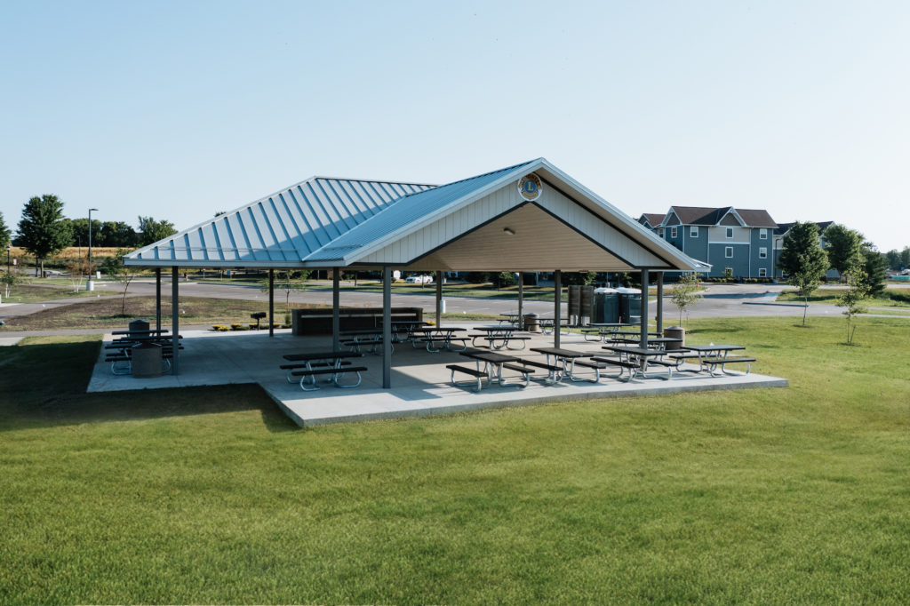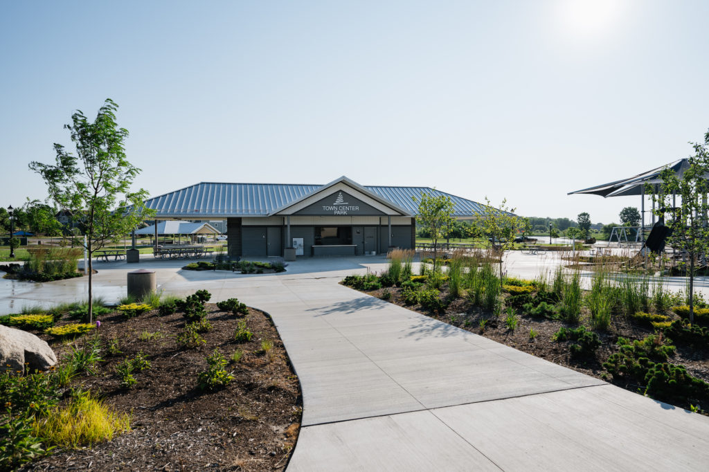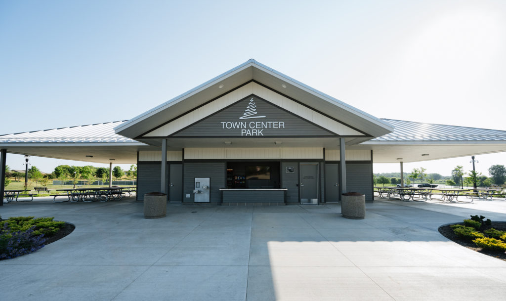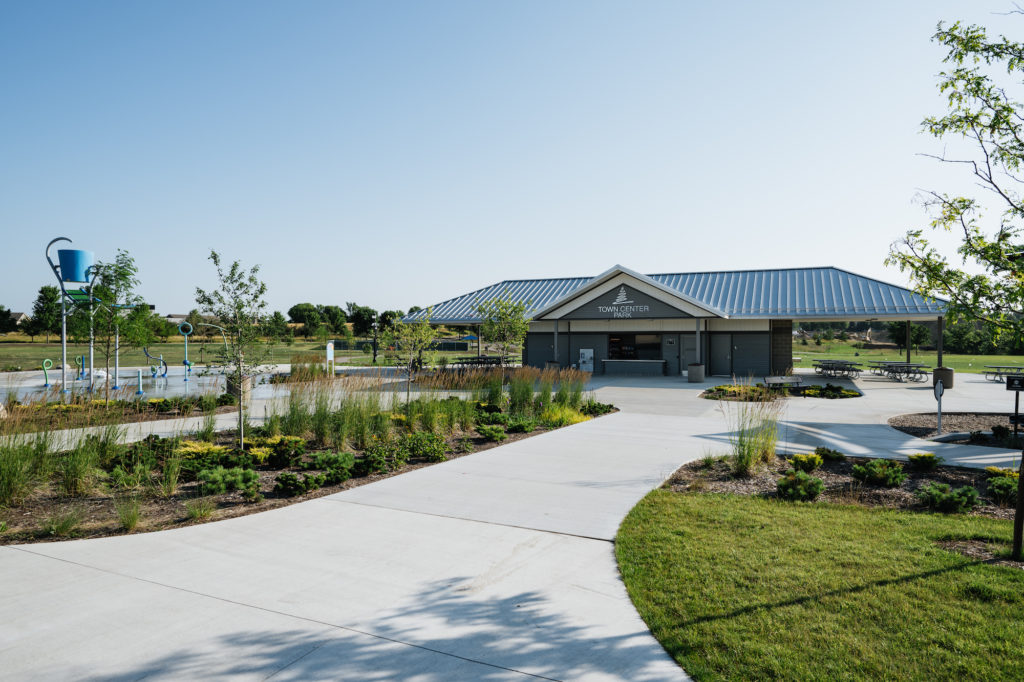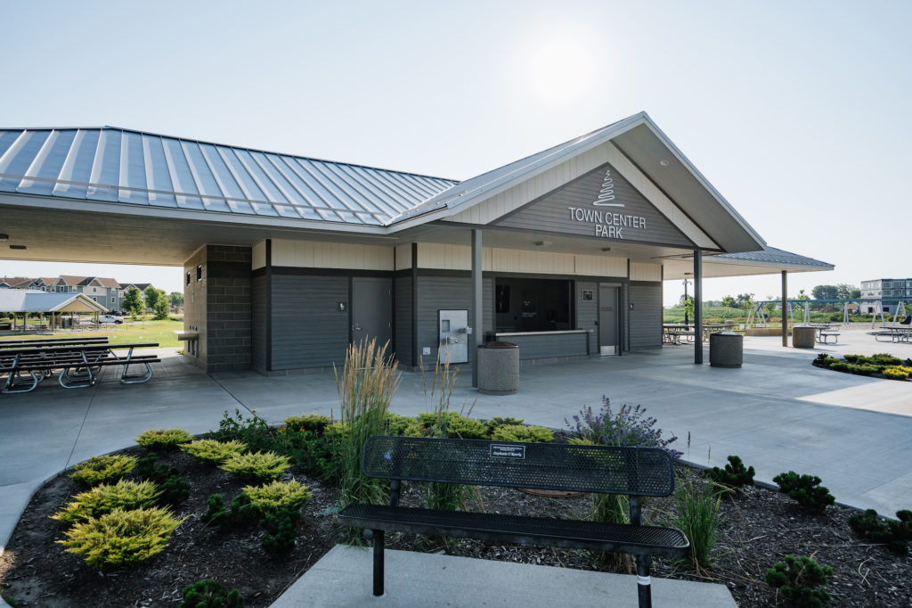A combined concessions building and bath house situated at the entry to the park is classic in color and form, and offers support, shade, and services to the surrounding splash pad and playground. The large, covered pavilion is located across the park, and provides gathering and performance space to the community. Building materials were inspired by the adjacent City office building, and just as important as design aesthetics were sight lines, durability, cleanliness, and safety.